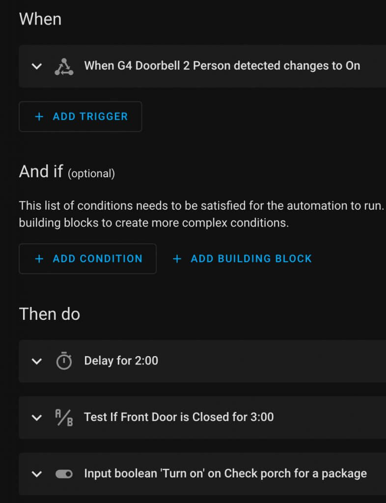 The automation is triggered when the doorbell detects a person. The Unifi G4 can detect packages and that is available in Home Assistant, but I’m just using the person detection since it could be a neighbor dropping something off and not a “package”.