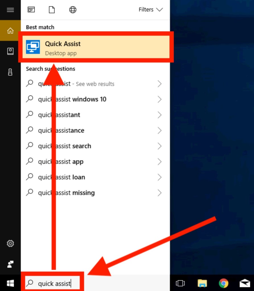 Click the Start button. Type Quick Assist in the search bar. Select the Quick Assist app from the results.